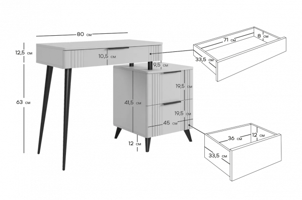 Представляем вам элегантный и функциональный туалетный столик «Катрин»! Этот предмет мебели станет стильным дополнением к вашей спальне и предоставит удобное место для хранения вещей, а также может использоваться как письменный стол.
